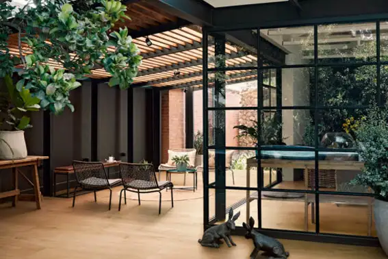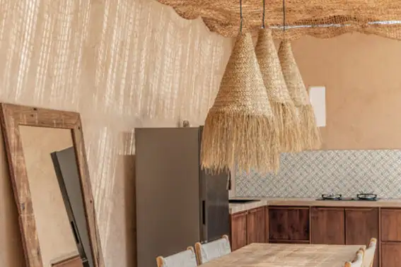 Unificar terrazas y salones a través de la paleta cromática genera continuidad visual. Colores tierra, verdes apagados, crudos y tonos piedra conectan con el exterior y generan ambientes serenos. Combínalo en el exterior con texturas como lino, algodón lavado, yute, cuerda o ratán. En salones, puedes combinarlo con terciopelos, lanas o tejidos más pesados para lograr contraste y profundidad.