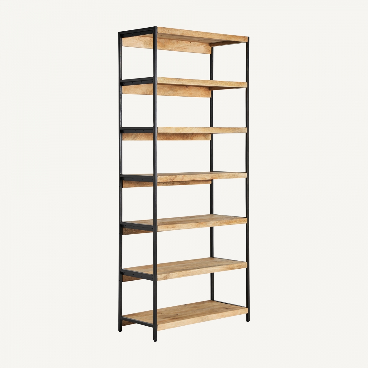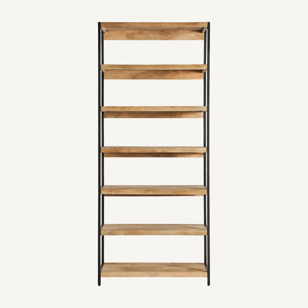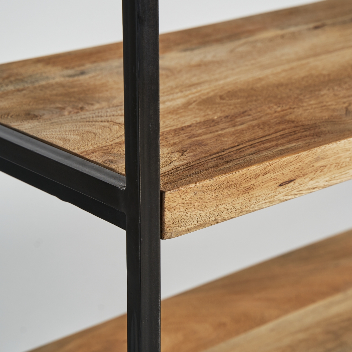 Estantería Celle, en color negro/natural, de estilo colonial. Fabricado en madera de mango, combinado con hierro.