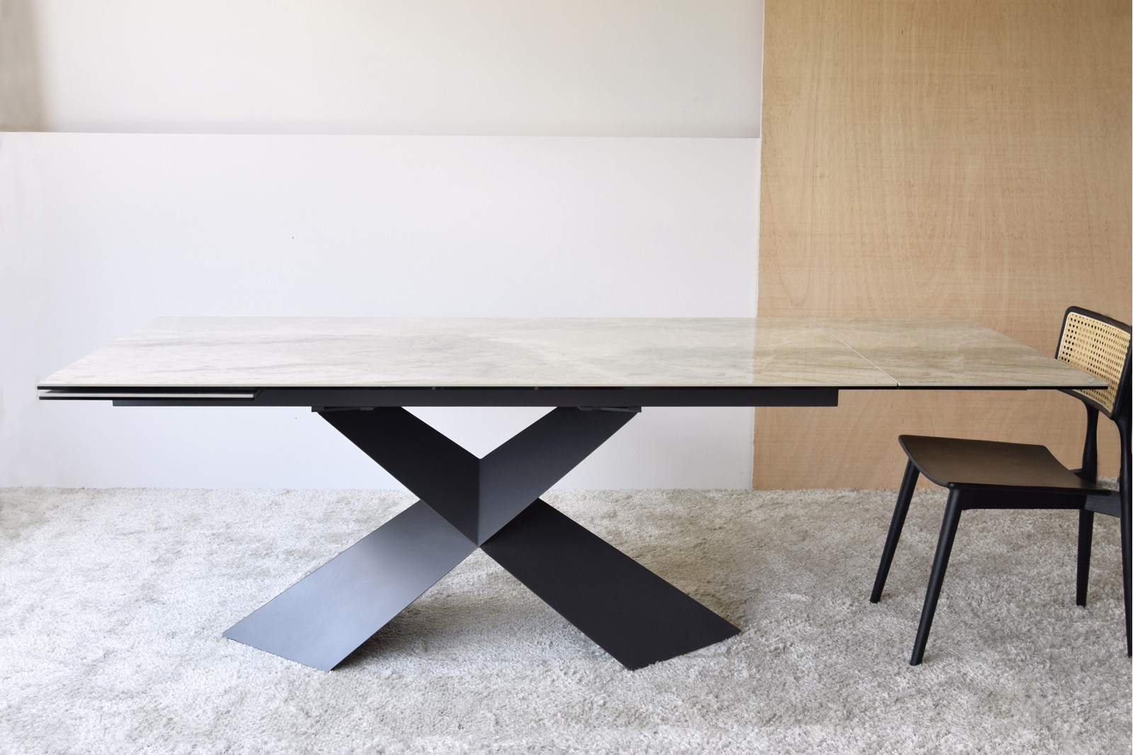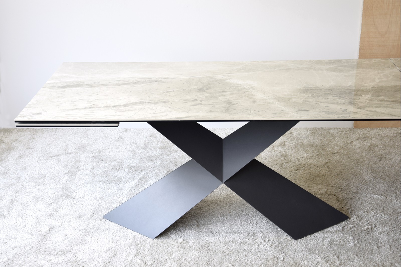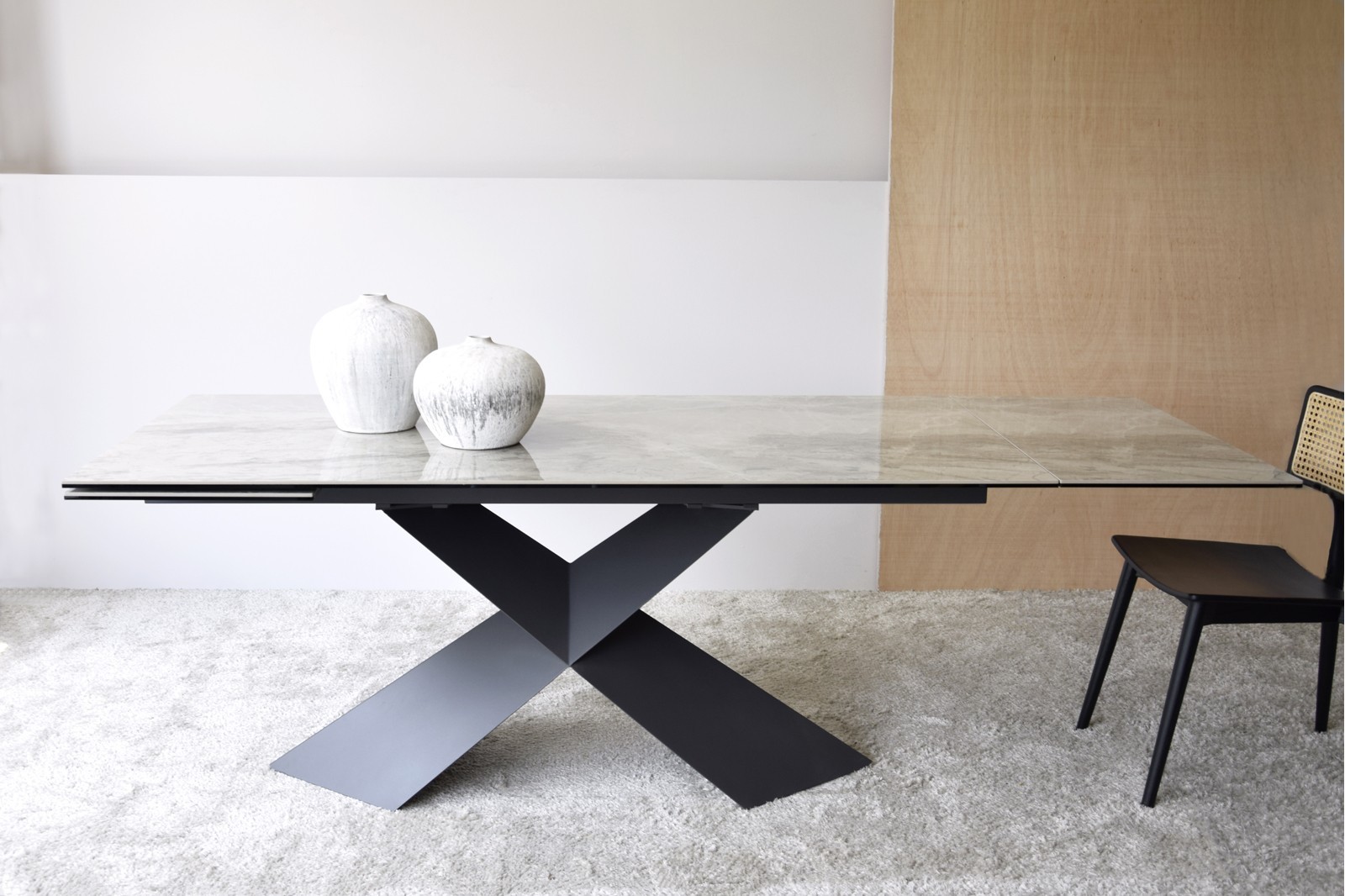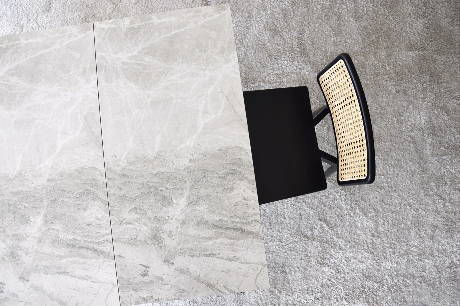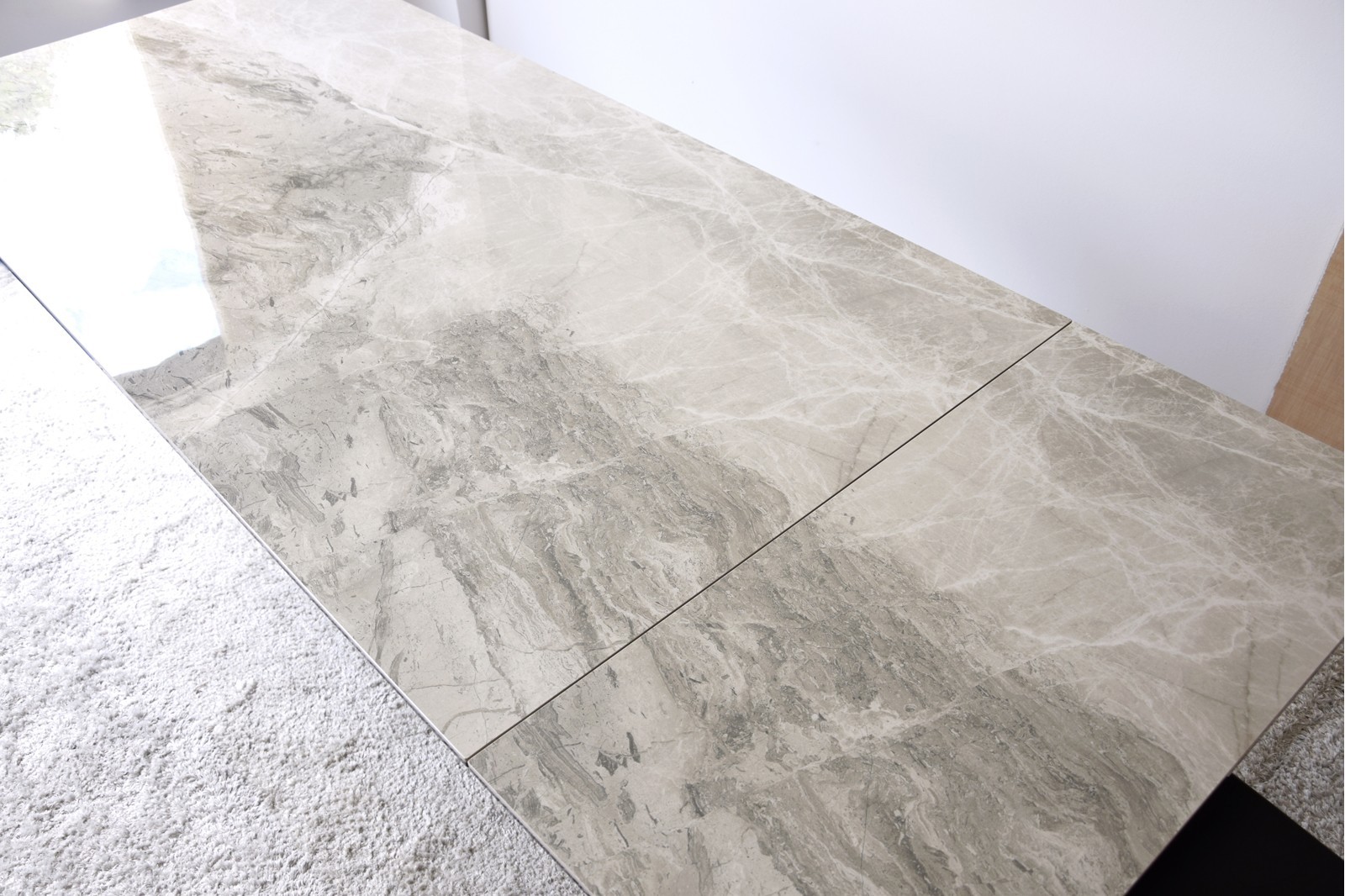 Mesa de comedor extensible con sobre realizado en material cerámico acabado mármol en tono gris con vetas en blanco y distintas gamas de grises que hacen de esta superficie toda una pieza decorativa que recuerda los materiales naturales. la parte superior está compuesta por una pieza central en material cerámico de 5.5mm de espesor colocada sobre lamina de vidrio de 8mm y dos extensiones en ambos extremos de 45cm cada una de ellas.