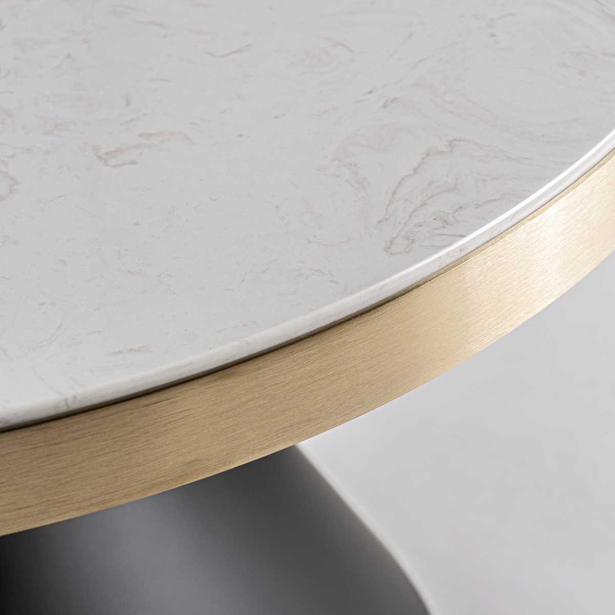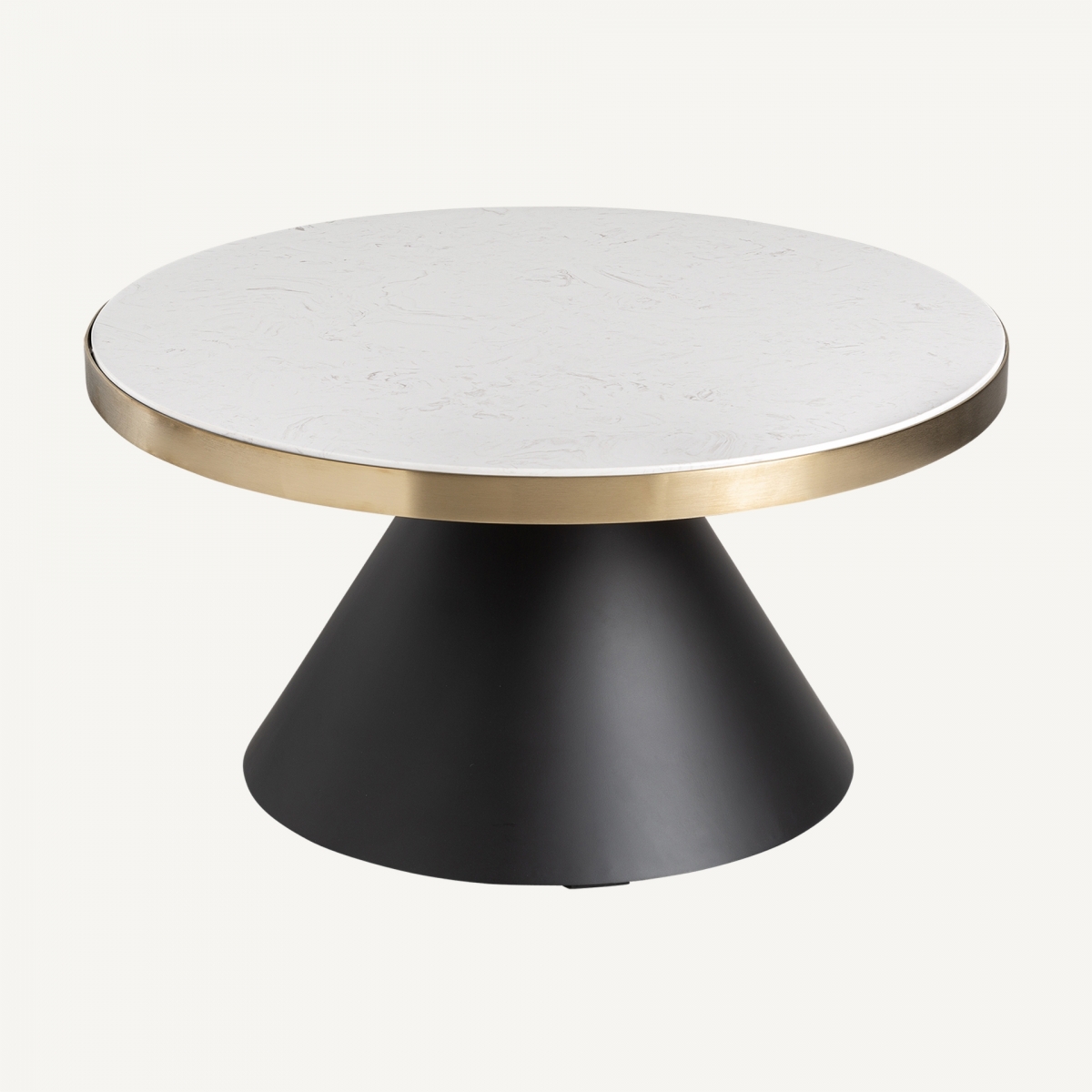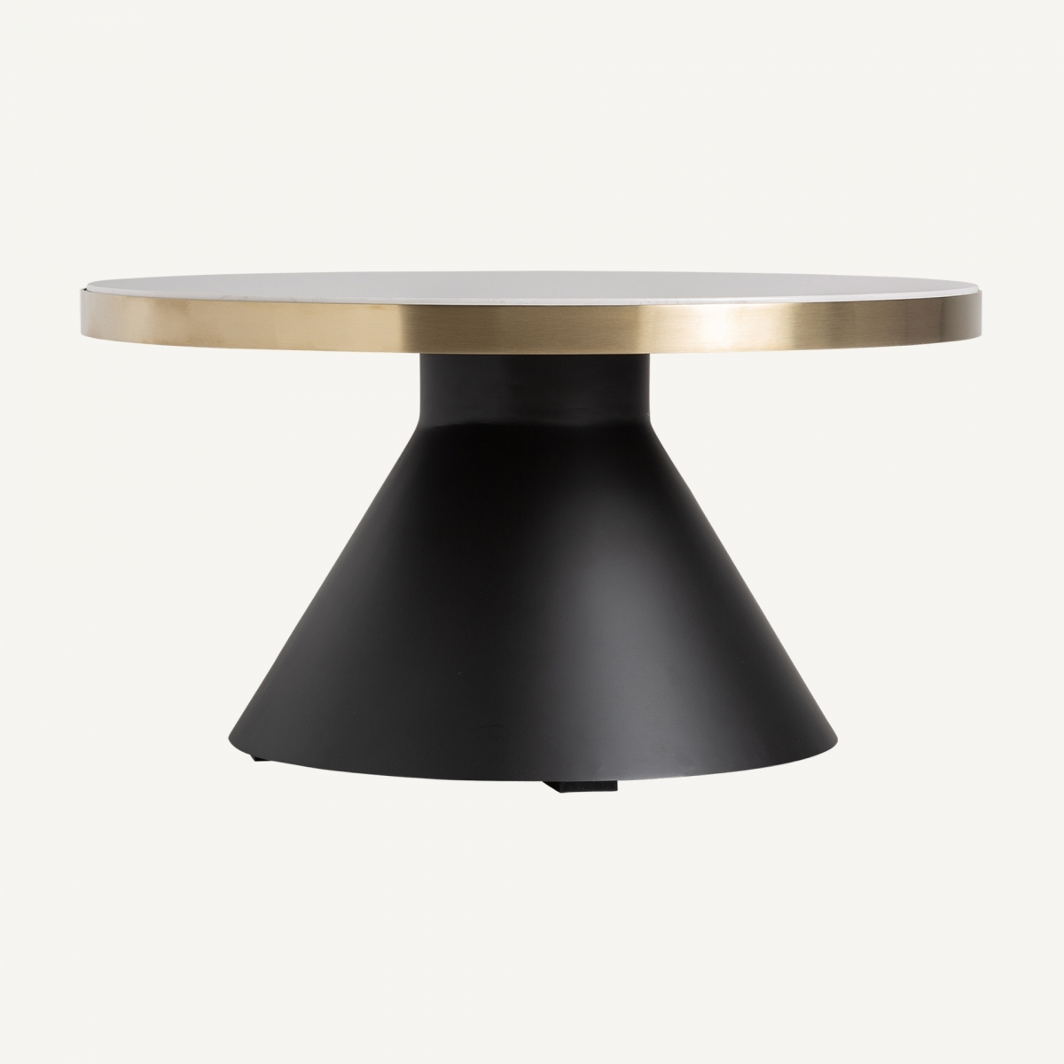 Mesa de centro Banloc, en color negro y oro mate, de estilo art deco. Fabricado en acero, combinado con mármol sintético. Producto desmontable.