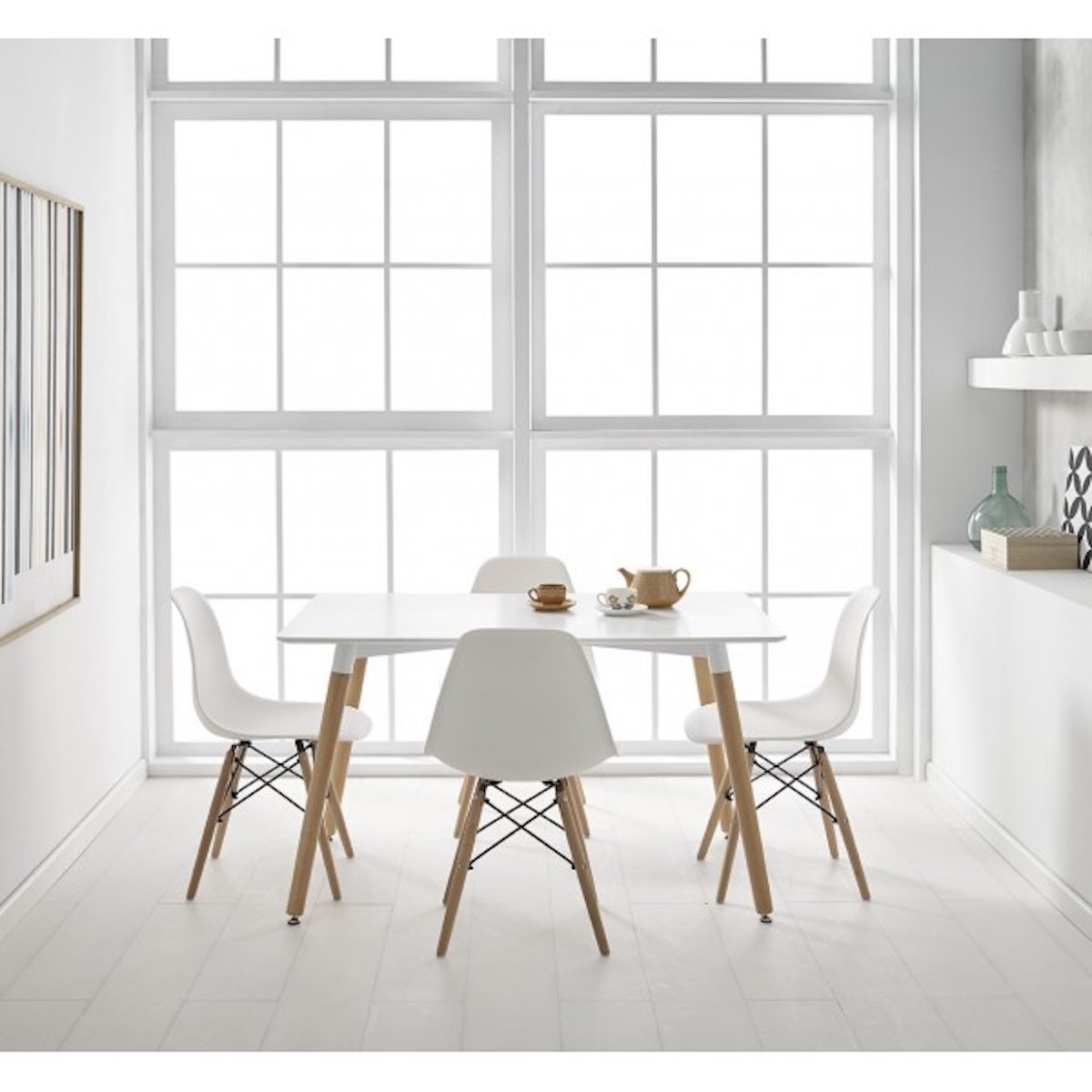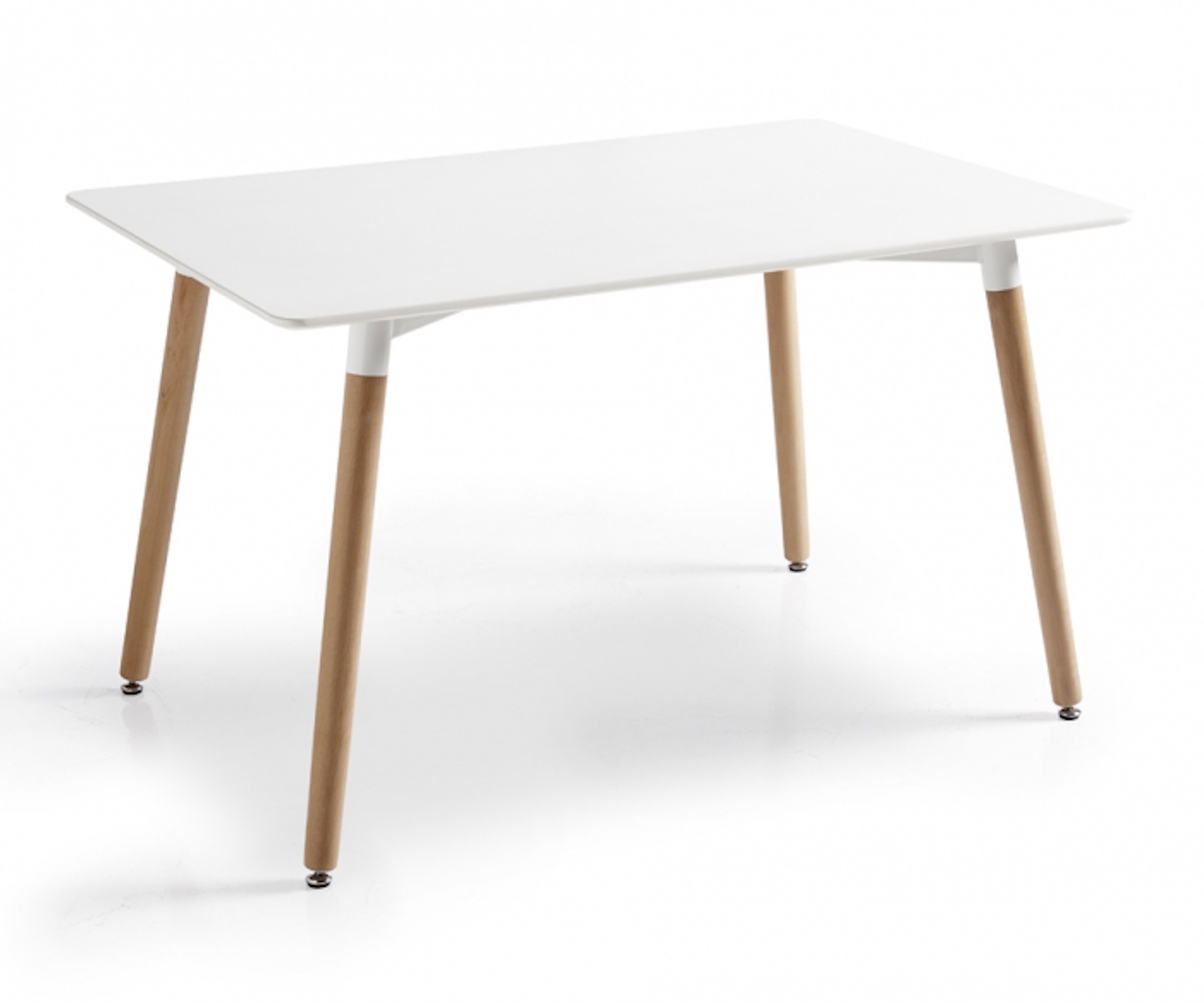 Mesa fija con patas cónicas en madera de haya color natural y tablero lacado en blanco. Estilo nórdico.