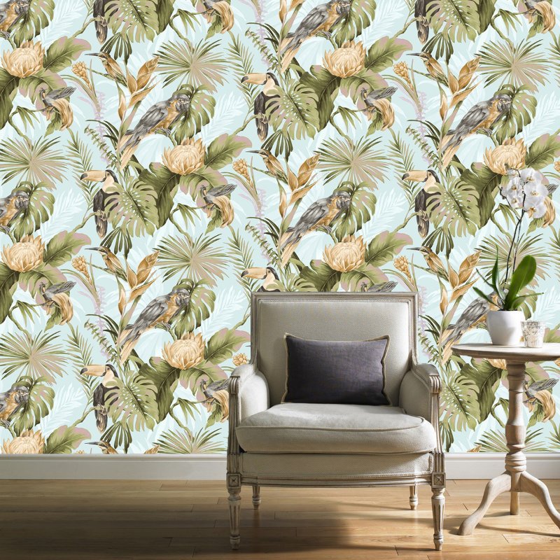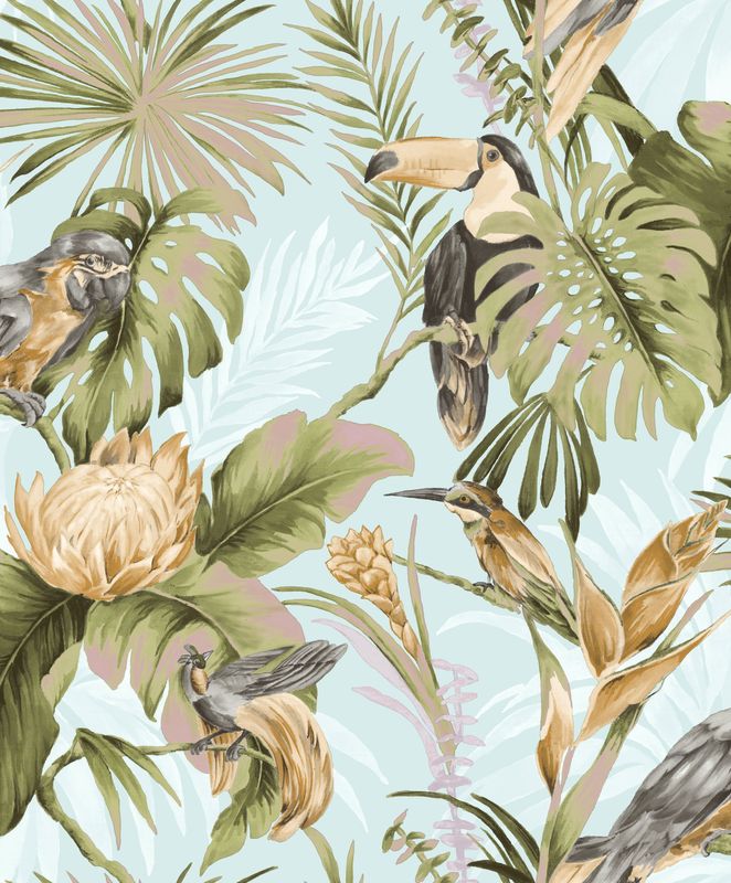 Papel pintado estilo tropical, con aves del paraíso, de la colección Amazzonia. Producto súper lavable, sencillo de colocar, con buena resistencia a la luz y fácil de pelar en seco. Tamaño rollo: 10,05 m x 53 cm.