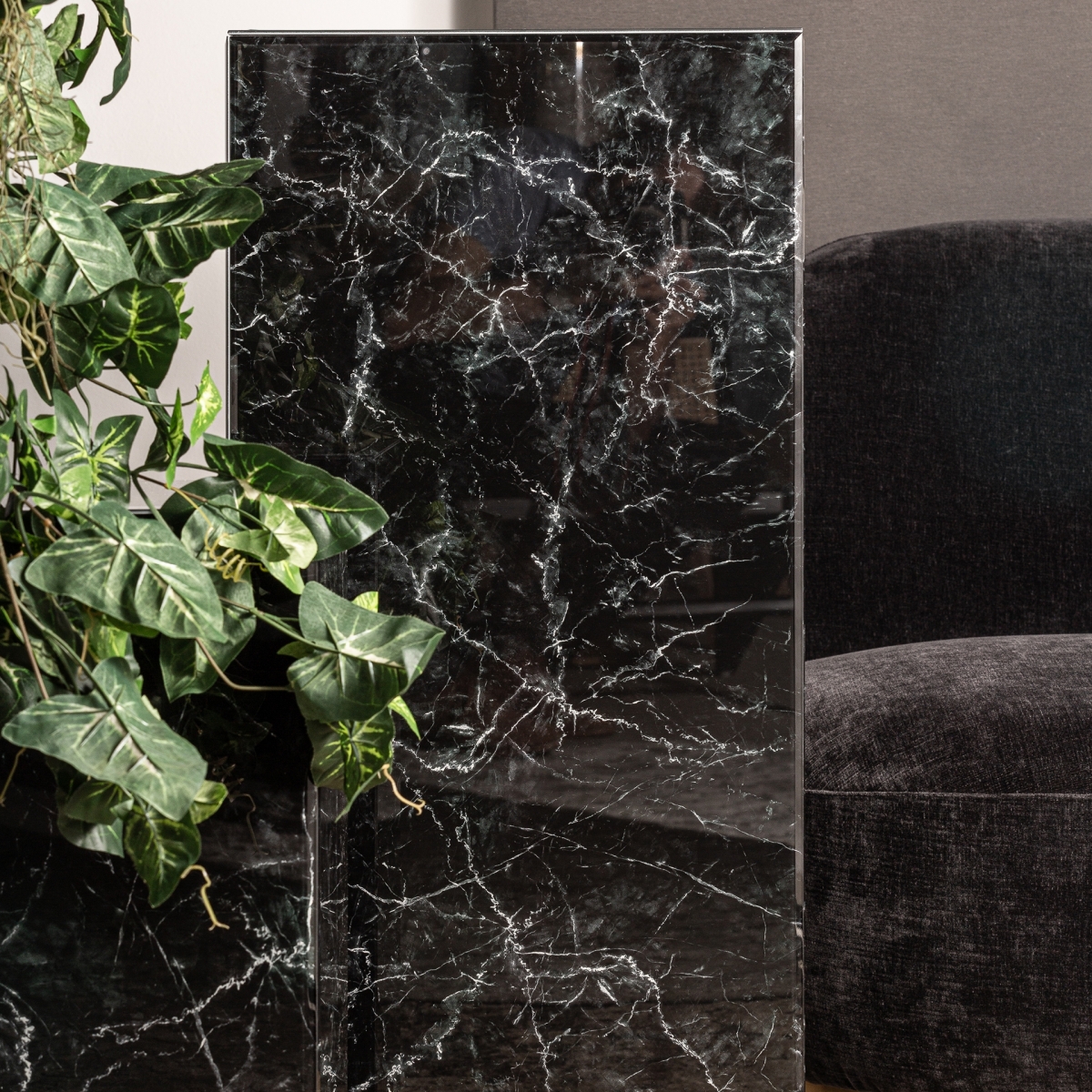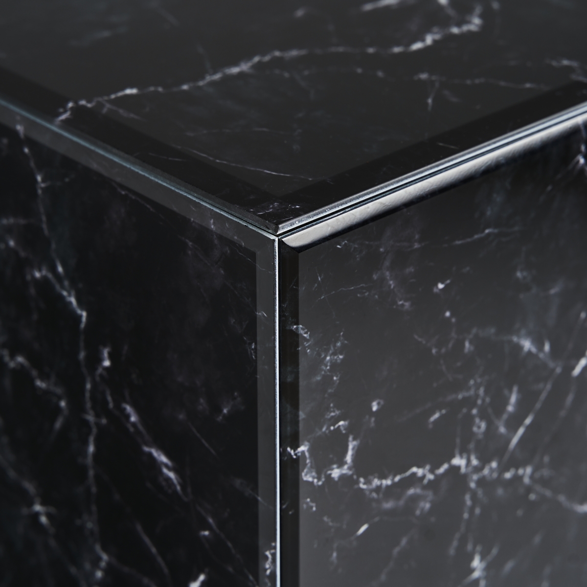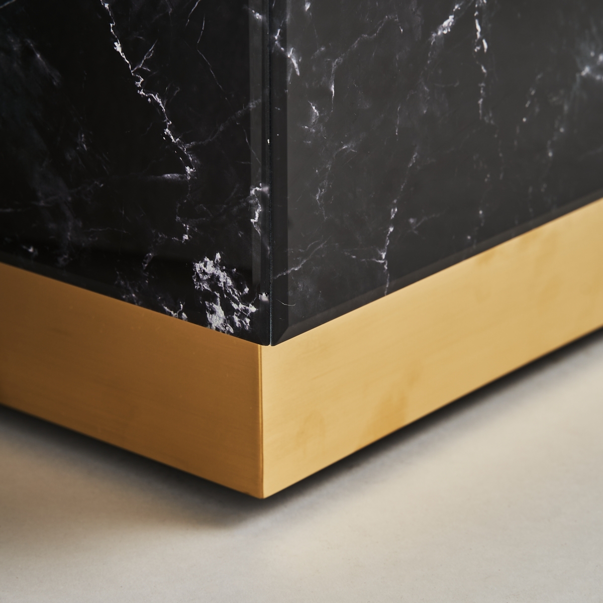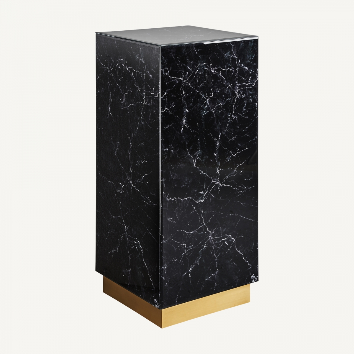 Peana Neva, en color negro y oro mate, de estilo art deco. Fabricado en vidrio, combinado con acero.