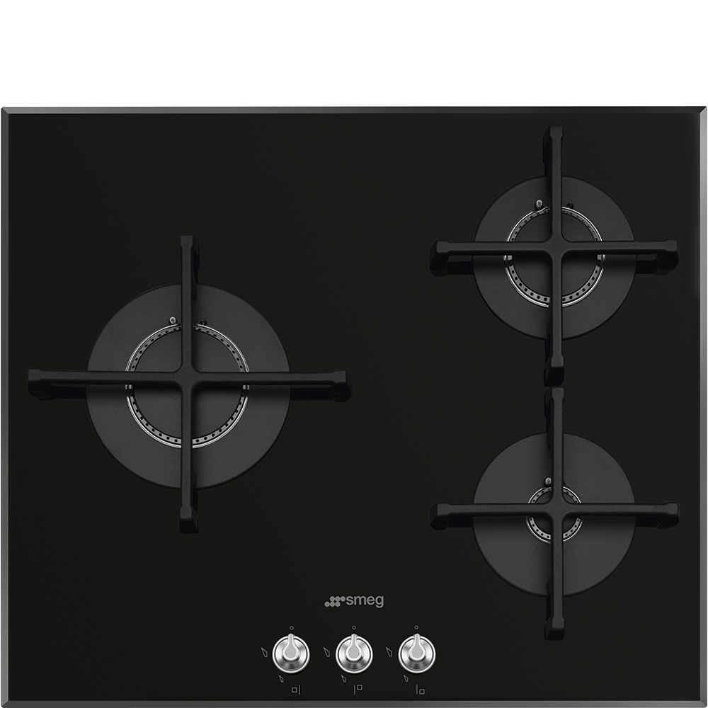 Placa de gas integrada Smeg PV163N2, en color negro, con 3 zonas de cocción: grande (3200 W), habitual (2600 W) y a fuego lento (1100 W).