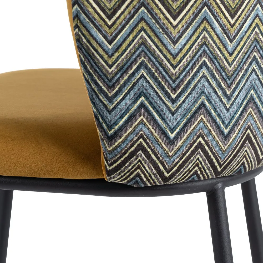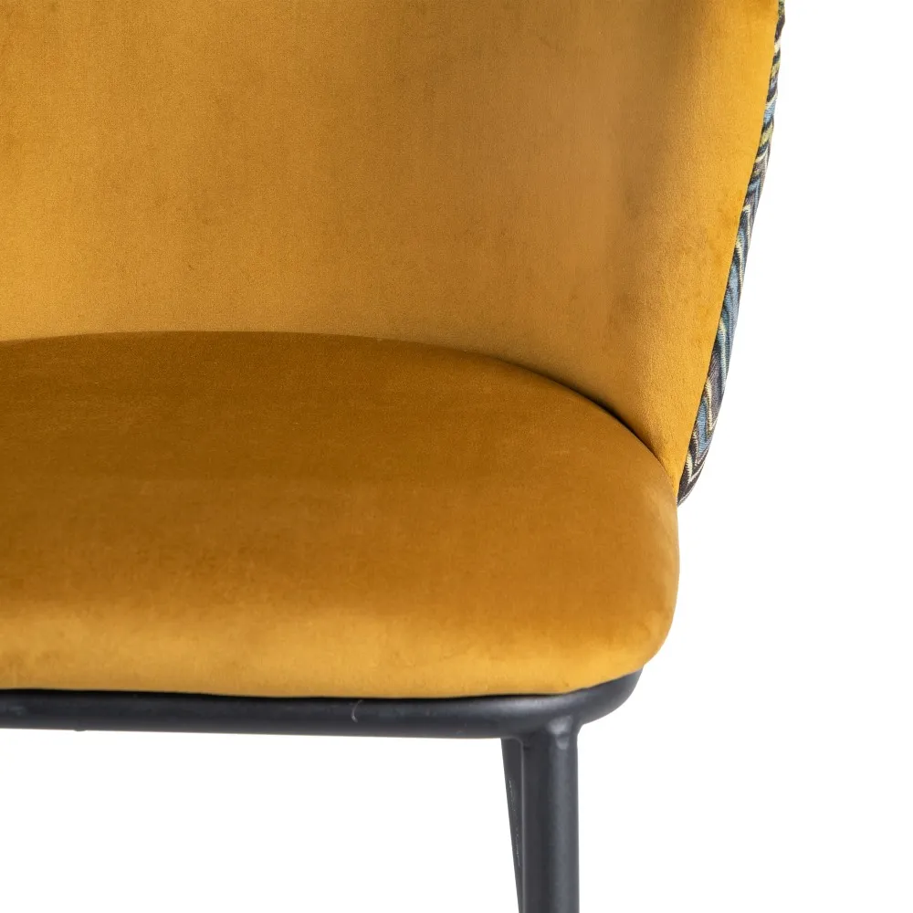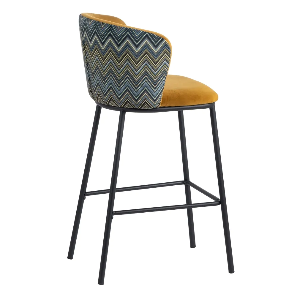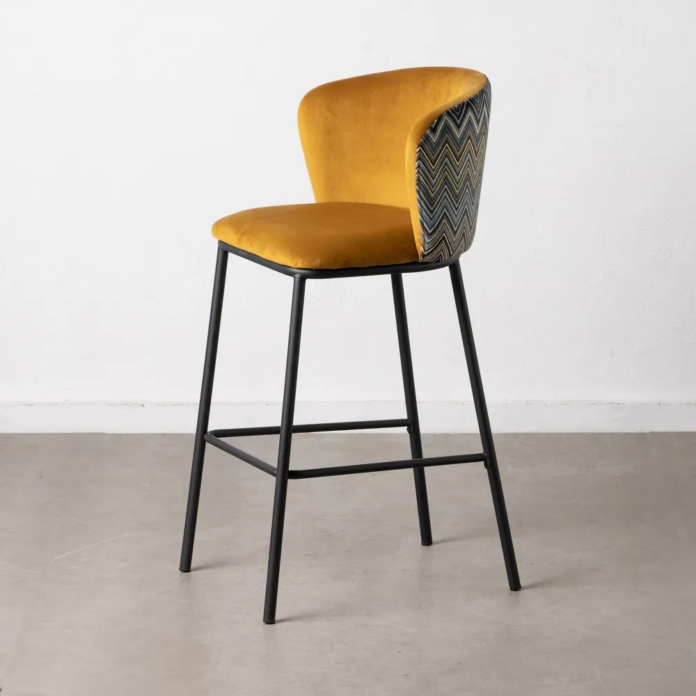 Taburete en color mostaza con estampado geométrico en el respaldo. Tejido 100% poliéster y patas de acero, para montar.