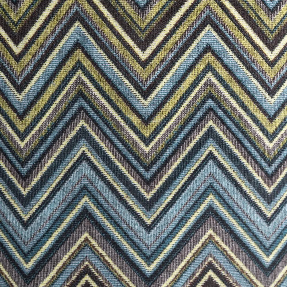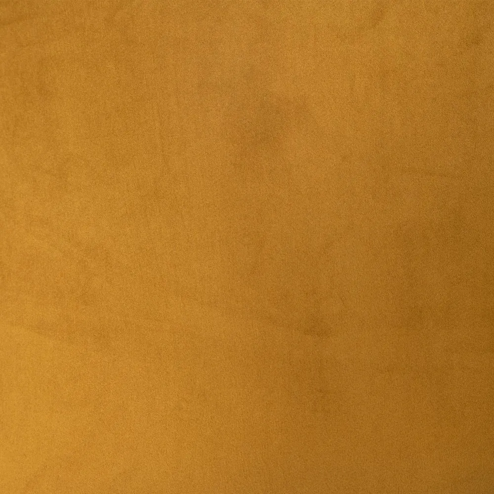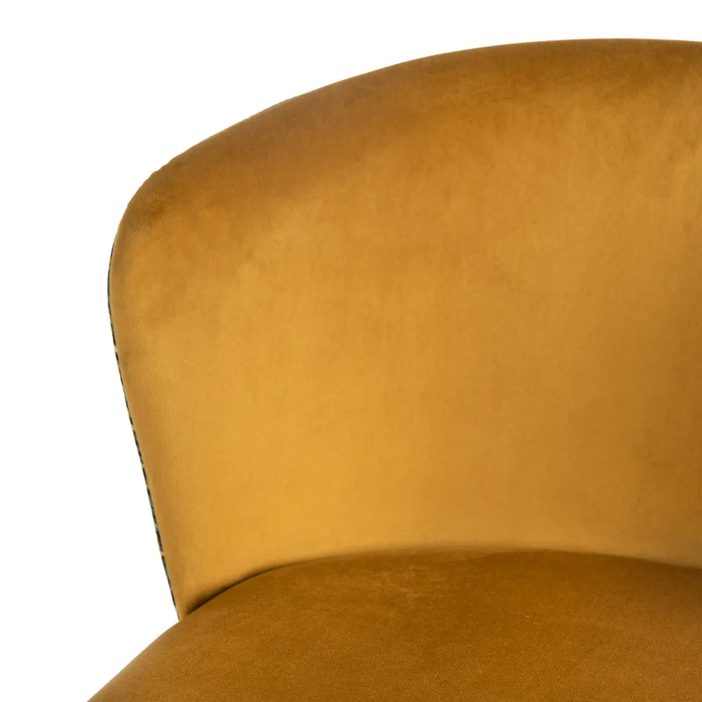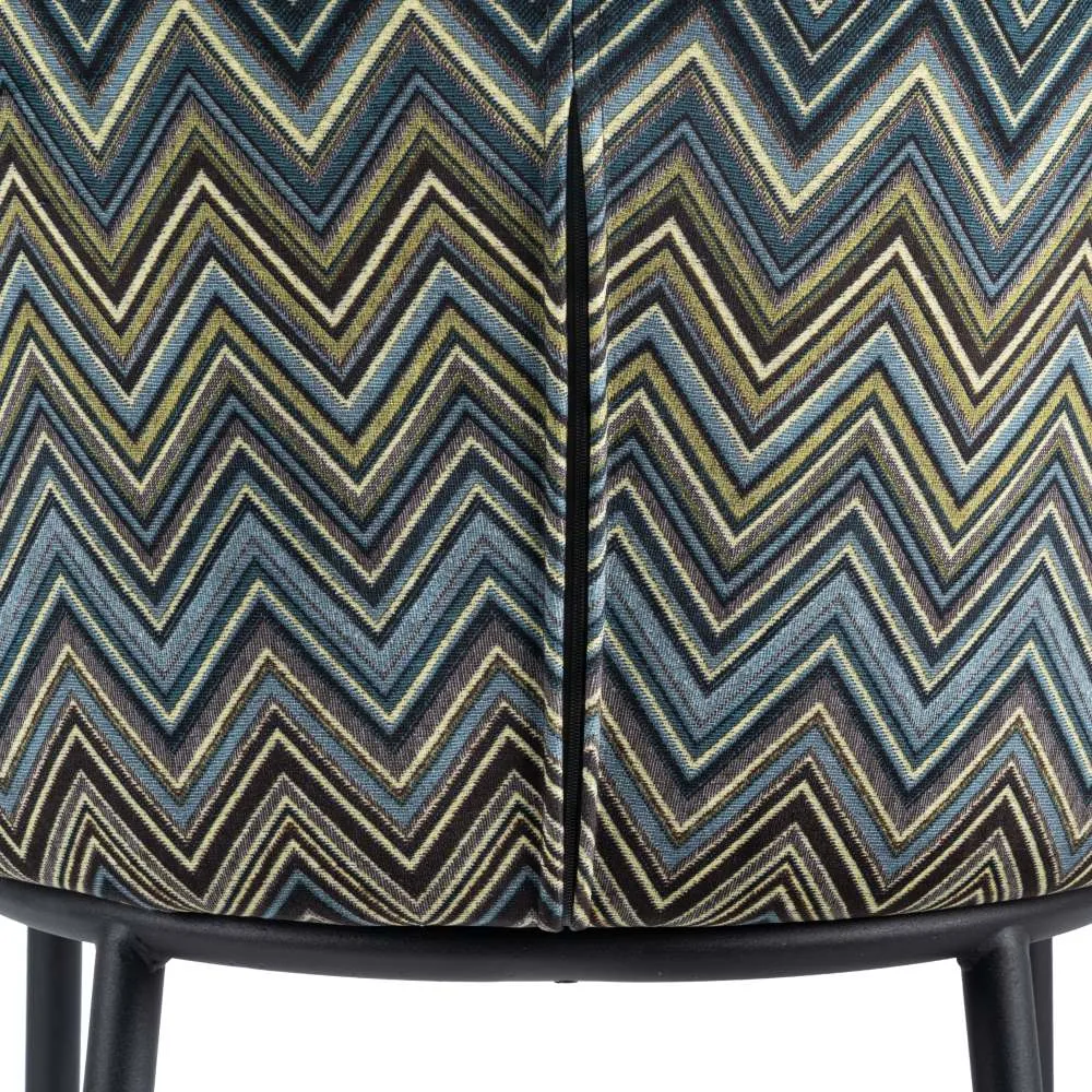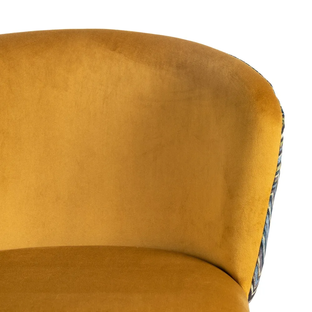 Taburete en color mostaza con estampado geométrico en el respaldo. Tejido 100% poliéster y patas de acero, para montar.